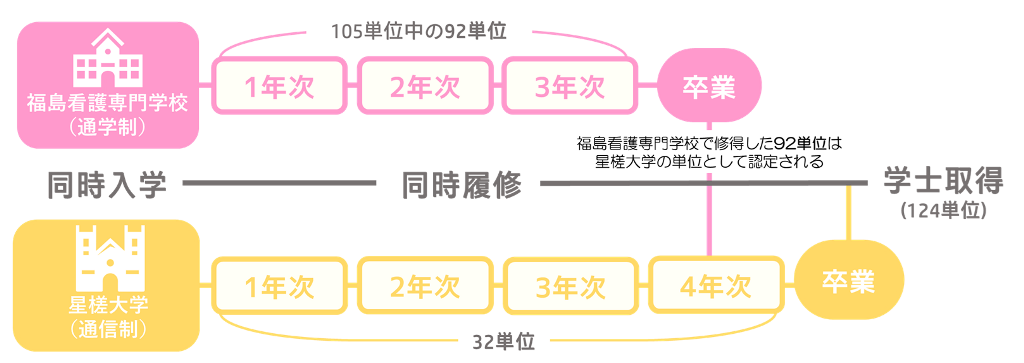 学生が専門学校に在籍しながら、大学にも籍を置いて、同時に学修を進め2つの学校の卒業を目指すことです